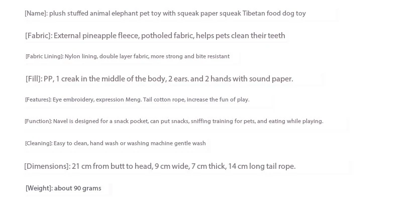 Introducing our High Quality Sniffing Plush Hidden Food Multi-Color Elephant Shaped Squeaky Dog Chew Toy! This delightful elephant-shaped toy is crafted with premium plush material for your pet's utmost comfort and safety. The multi-color design adds a vibrant touch to your pet's playtime, while the hidden food compartments keep your furry friend engaged and active. The squeaky element provides added fun and excitement, making this toy a must-have for any dog lover.