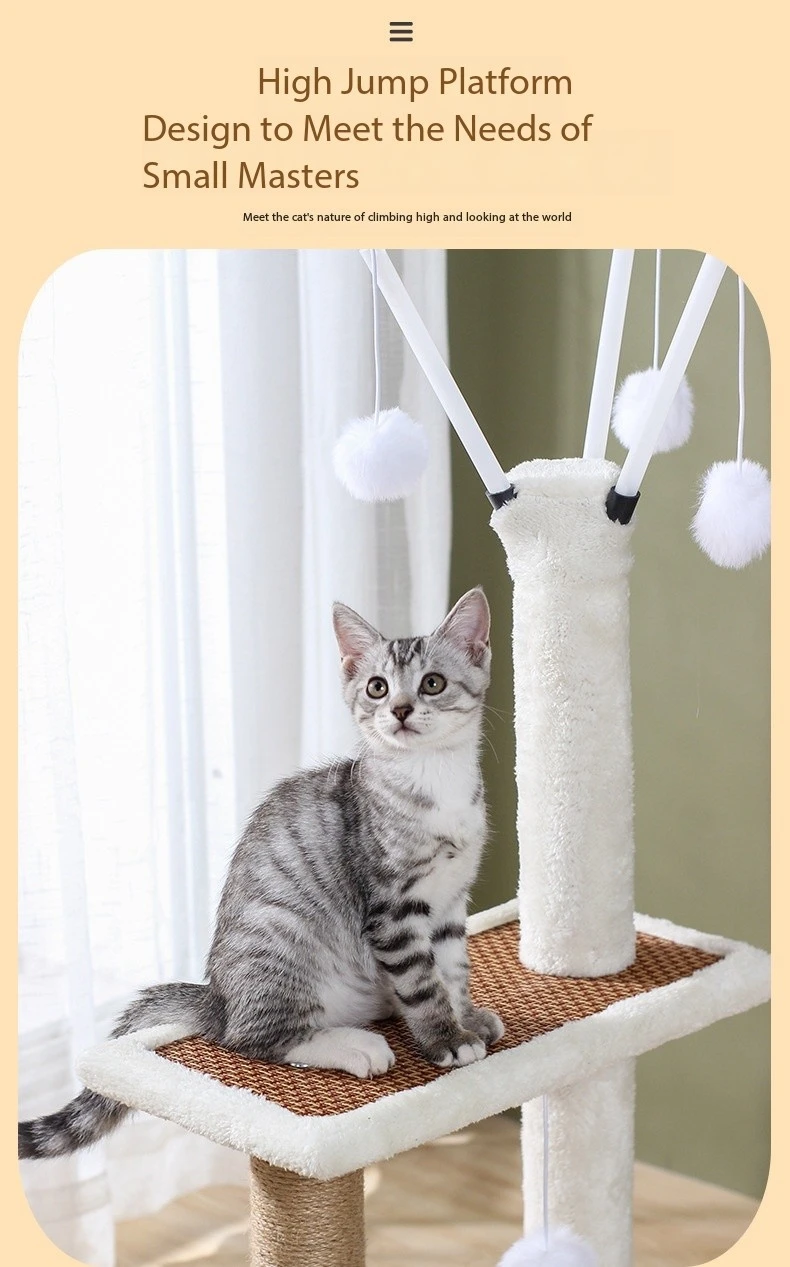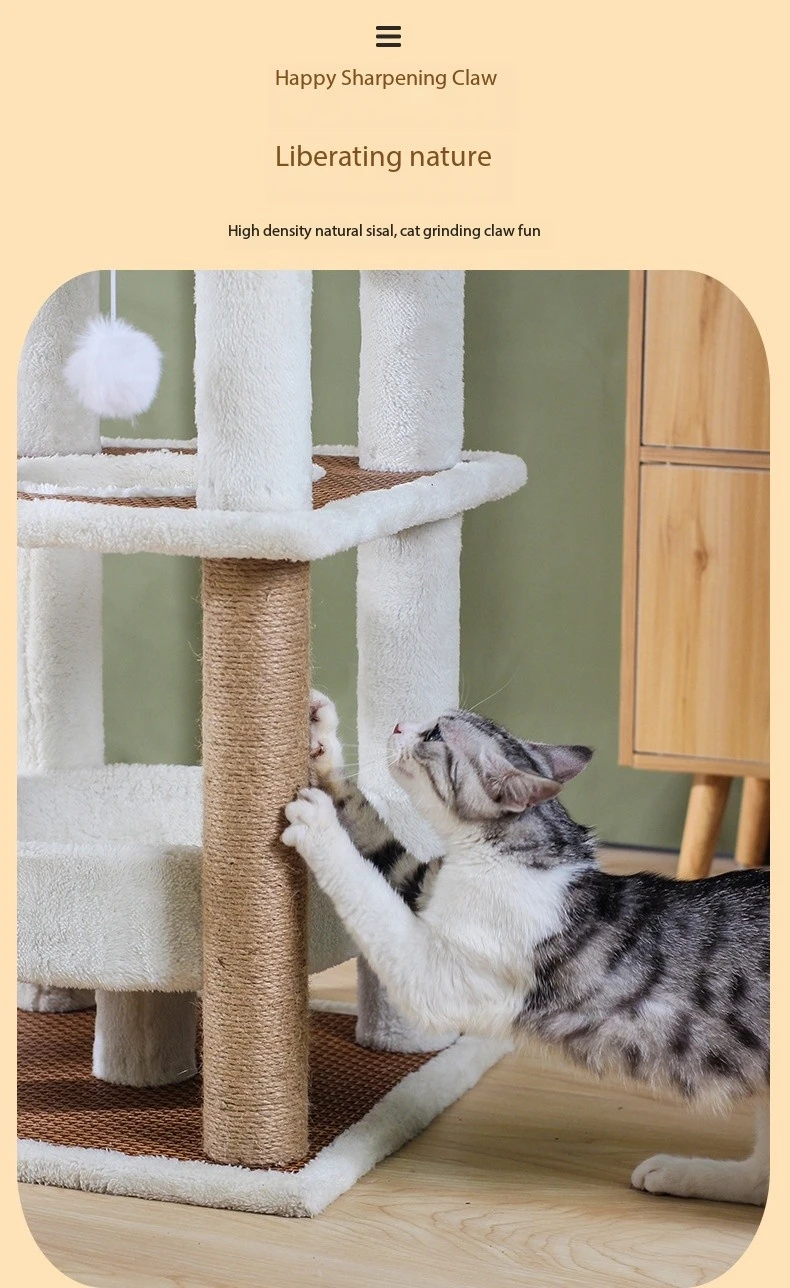 Sisal Scratch Posts: Embedded within the tower are sisal scratching posts, providing cats with a dedicated surface to satisfy their scratching needs. Sisal is a durable and rough-textured material that effectively trims cats' claws and promotes healthy scratching behavior. With multiple sisal scratch posts distributed throughout the tower, cats have plenty of opportunities to engage in this instinctual behavior, helping to protect furniture and maintain their claws.