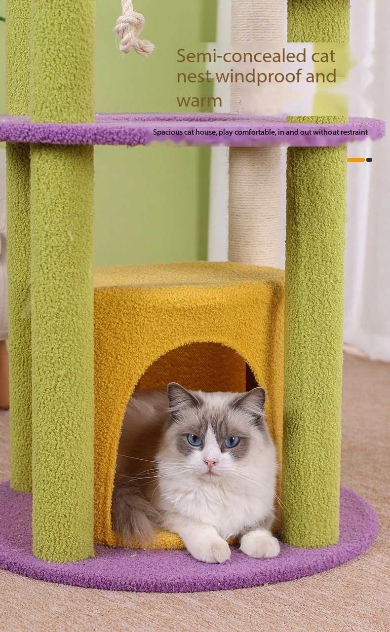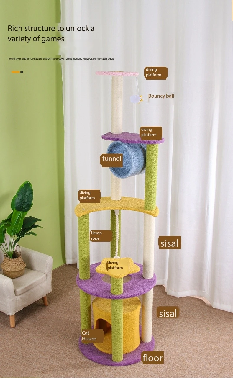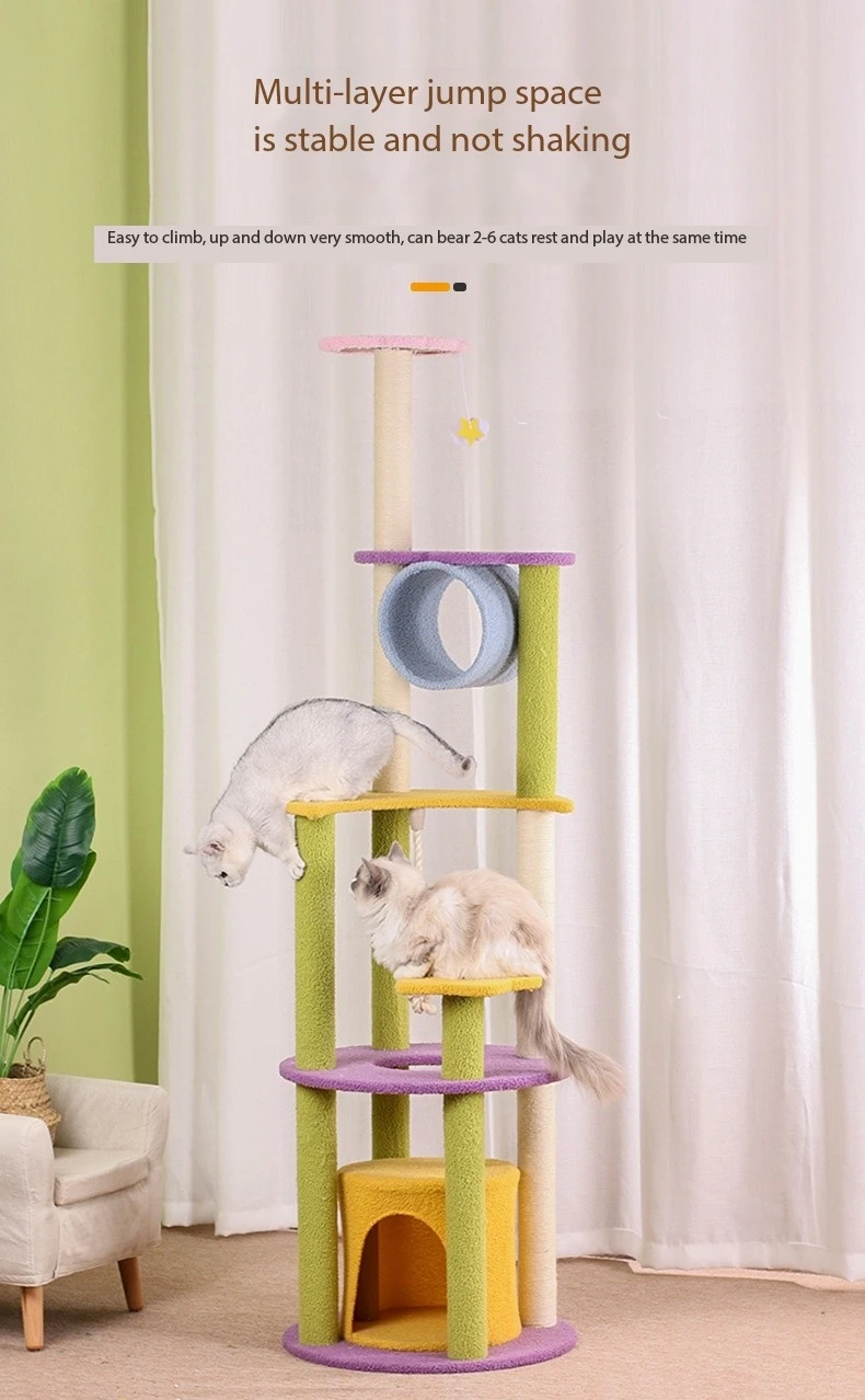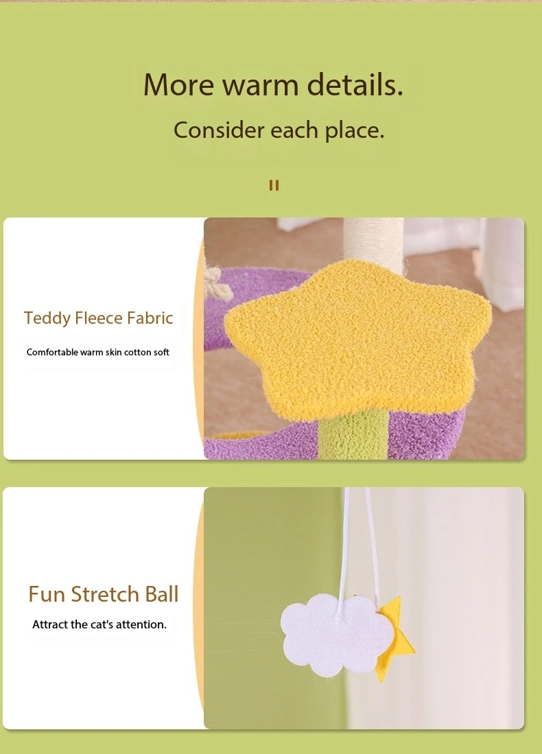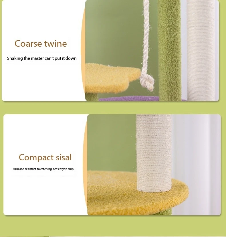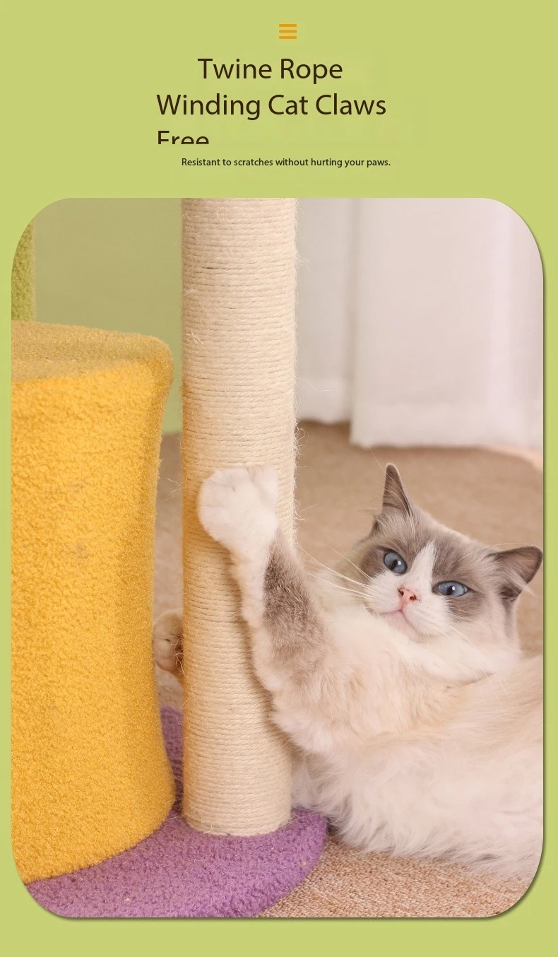 Sturdy Construction: Built with stability and durability in mind, this cat scratch tower is constructed from sturdy materials to withstand the rigors of daily use. The base is wide and heavy, providing a solid foundation to support the entire structure and prevent tipping over during energetic play. Reinforced platforms and sisal scratching surfaces are securely attached to the frame, ensuring a safe and stable environment for cats to play and relax. The sturdy construction of the tower gives pet owners peace of mind, knowing that their cats are safe and secure while enjoying their favorite activities.