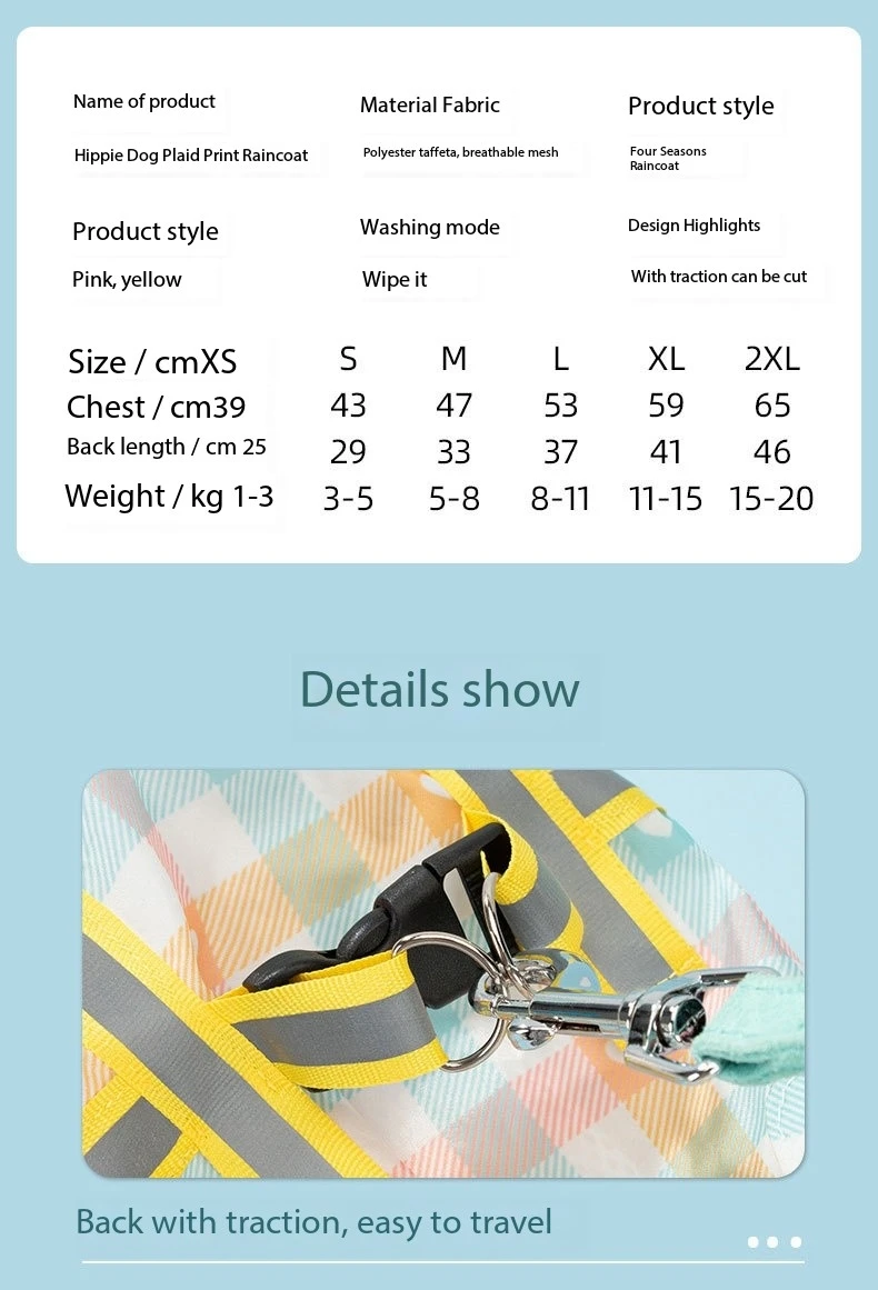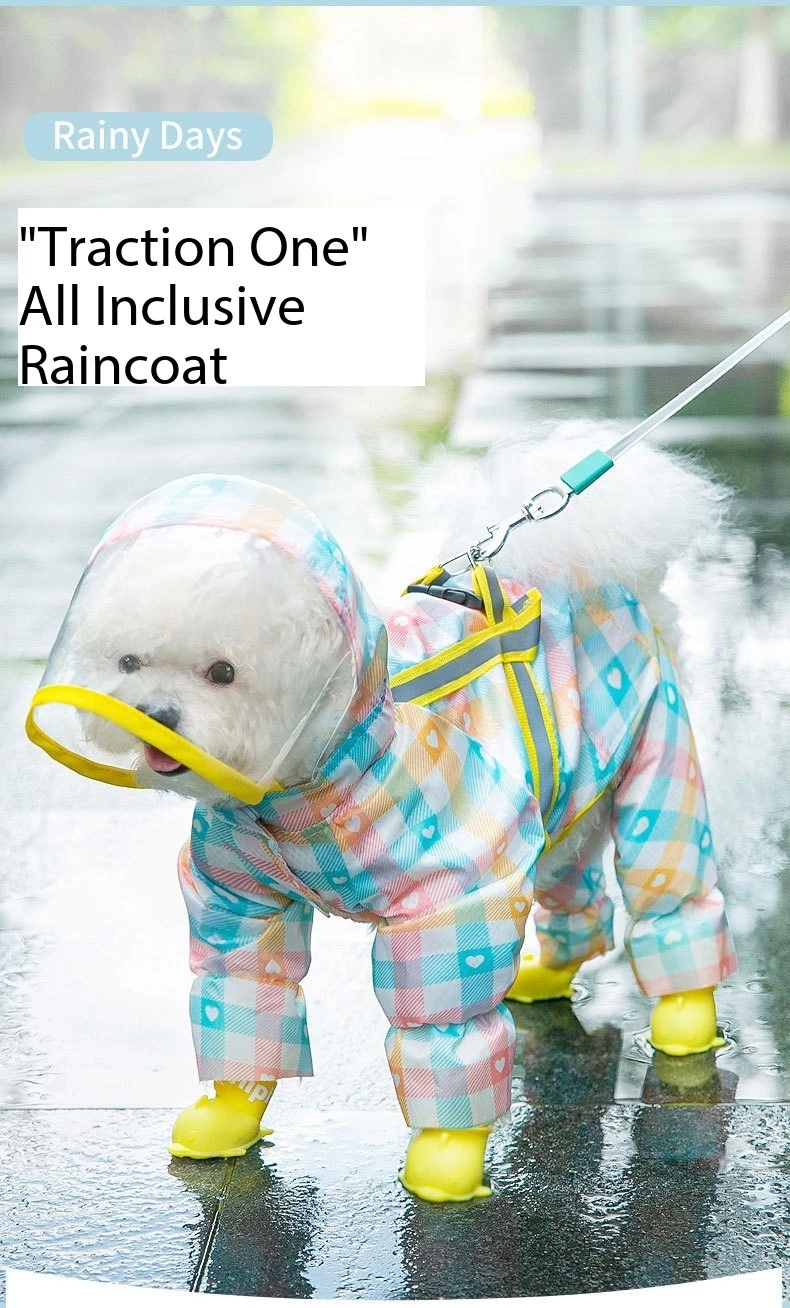 "Don't let rainy days dampen your dog's spirits! Our Dog Raincoat is the perfect solution to keep your pet dry and happy during wet weather outings. Its lightweight and breathable fabric ensure maximum comfort, while the vibrant color options add a pop of personality to your pup's wardrobe."